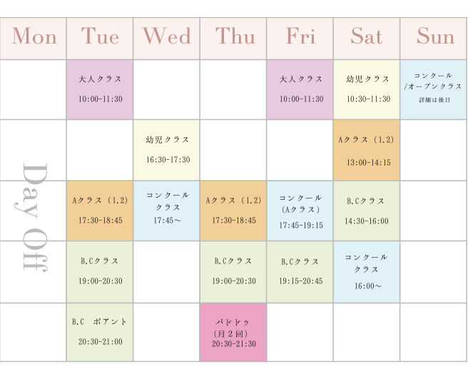 • 日曜日のレッスンは、週によって異なりますので、詳しくはインスタグラムをご覧ください。